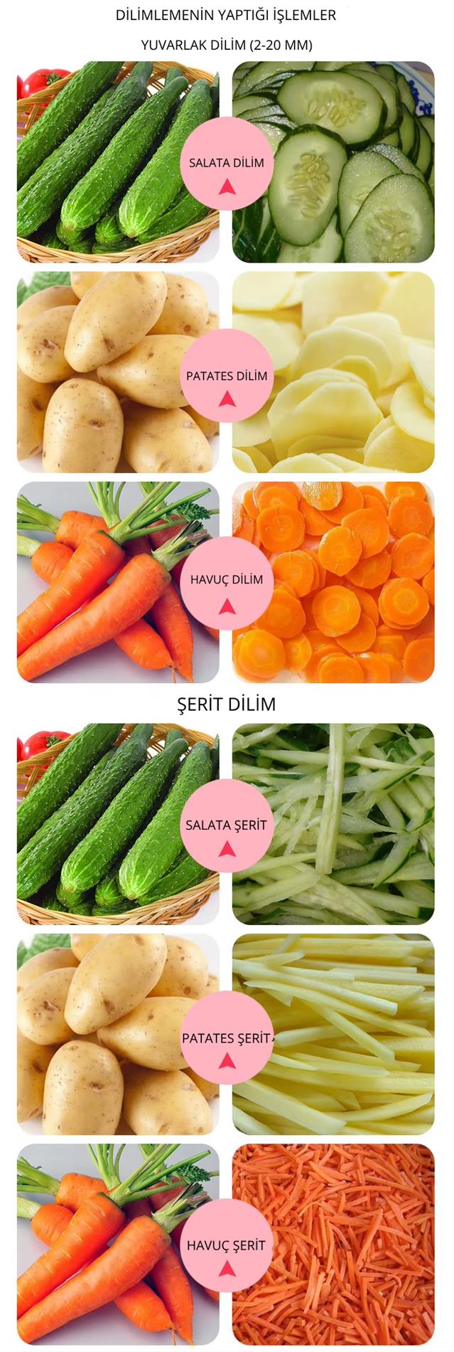 1. Bu seri kesme makineleri, meyve ve sebzeleri küp ve şerit şeklinde kesmek için yaygın olarak kullanılır. Turp, havuç, patates, ananas, tatlı patates, kavun, soğan, yeşil biber, mango, ananas, elma, jambon, papaya vb. gibi.
