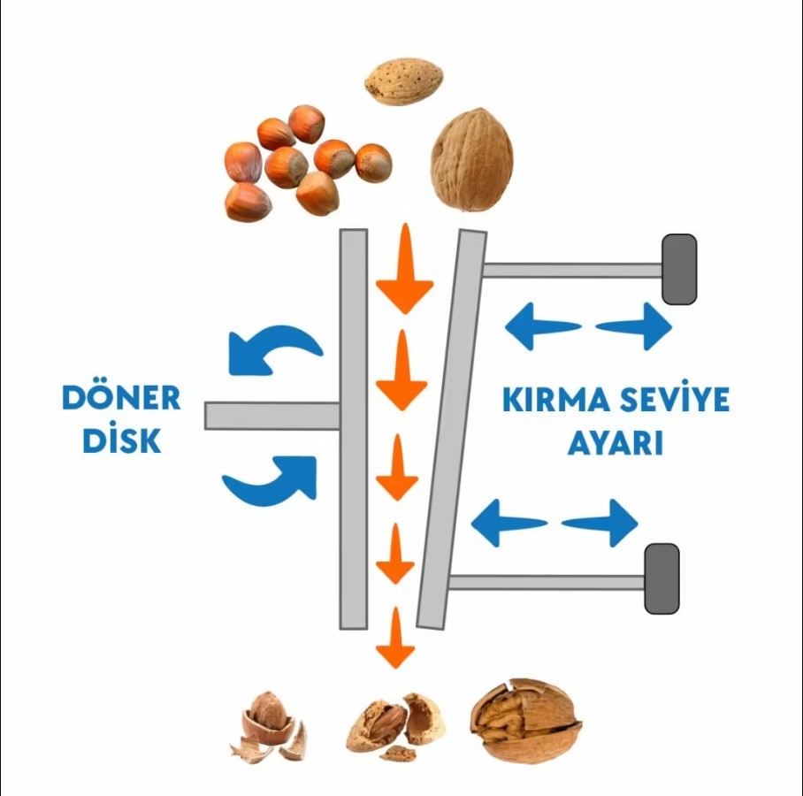 "V" biçiminde olan diskler arası kırım işlemi sayesinde ceviz, badem, fındık gibi tüm kabuklu yemişlerde boylarına göre ayırmaya gerek kalmadan başarılı kırım sağlar. Ancak bütün iç oranı yüksek isteniyosa boylama yapmak başarı oranını arttırır. Aşağıdaki şemada çalışma prensibi gösterilmektedir.